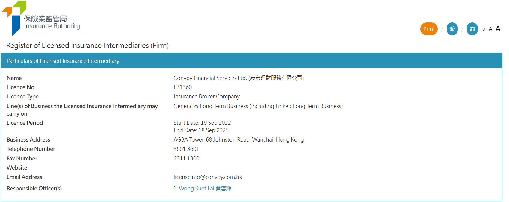 コンボイは香港の金融当局であるInsurance Authority(IA)の認可機関です。