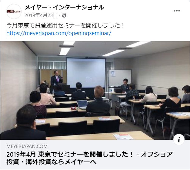 日本における活動はメイヤー・アセット・マネジメント社を設立した2000年代が全盛期だったと考えられます。その後、2019年に東京で資産運用セミナーを開催していた記録がありますが、近年は日本国内で積極的な活動はされていないようです。